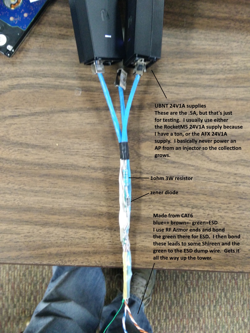 The last thing to add here is that I put this at the base, before the lead to the tower. *IF* I were feeding each supply to the tower on it's own CAT5e/6 line, then I could skip the resistor and just do the zener diode. CAT6 24AWGx8 conductors at 80' is about 1ohm of resistance. I don't want to run extra wires though.