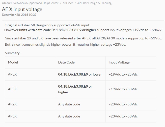 So just to re-cap on this thread, the 'newer' AFX radios that support up to 56V, can actually be run on any of the 24, 24VH, 48, and 48VH? That's a crazy amount of variety. Short cable runs, 24V, and long runs, 48V or 48VH? Should the old-style AFX's be run on 24 or 24VH? I have many that I am powering off of regular ToughSwiches that will be converted to Netonix soon, and just want to be sure.
