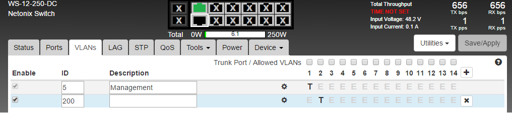 this seems to work, with my NIC set to VLAN 5 IP is available only on port 1, with it set to VLAN 200, it's only accessible on port 2.