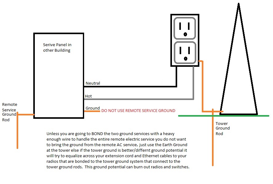3) If your electrical service ground rods are not bonded to tower ground rods due to distance then just use the HOT and NEUTRAL do not bring the ground from the service instead use the tower ground for your receptacle in the box. BUt still add the new ground rods to the electrical service. As seen in picture below.