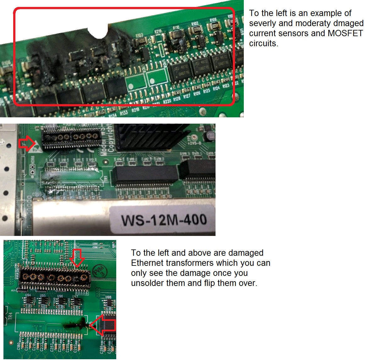 See picture below of fried Ethernet Transformers and Current Sensors.