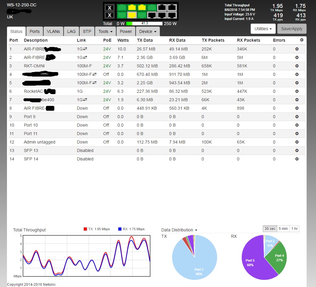 If you hook to batteries at the bottom and let's assume you only have 5V of drop which I think will be more under heavier loads and the batteries discharge to say 14V which means you are only getting 9V at the top and if you're up converting 9V to 50V (which is what the switch does) and then you want to deliver power for say 8 radios and 2 are AF24 and the rest are airMAX radios that is almost 200 watts peak.