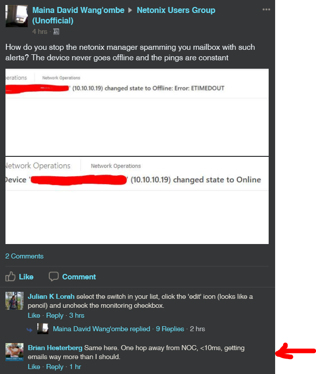 I have the netonix manager spamming my alerts mailbox with so many of this errors(have 40 or so switches on the network). Pings constant and switches never really go down. I have switches several radio hops away with double digit ms. Had stopped using the manager and only started managing the switches again with the most recent release(1.0.6) but this is still an issue since last year on my network.