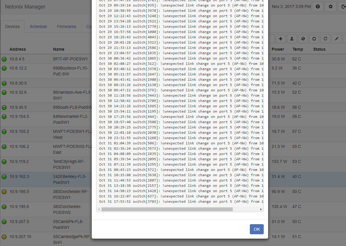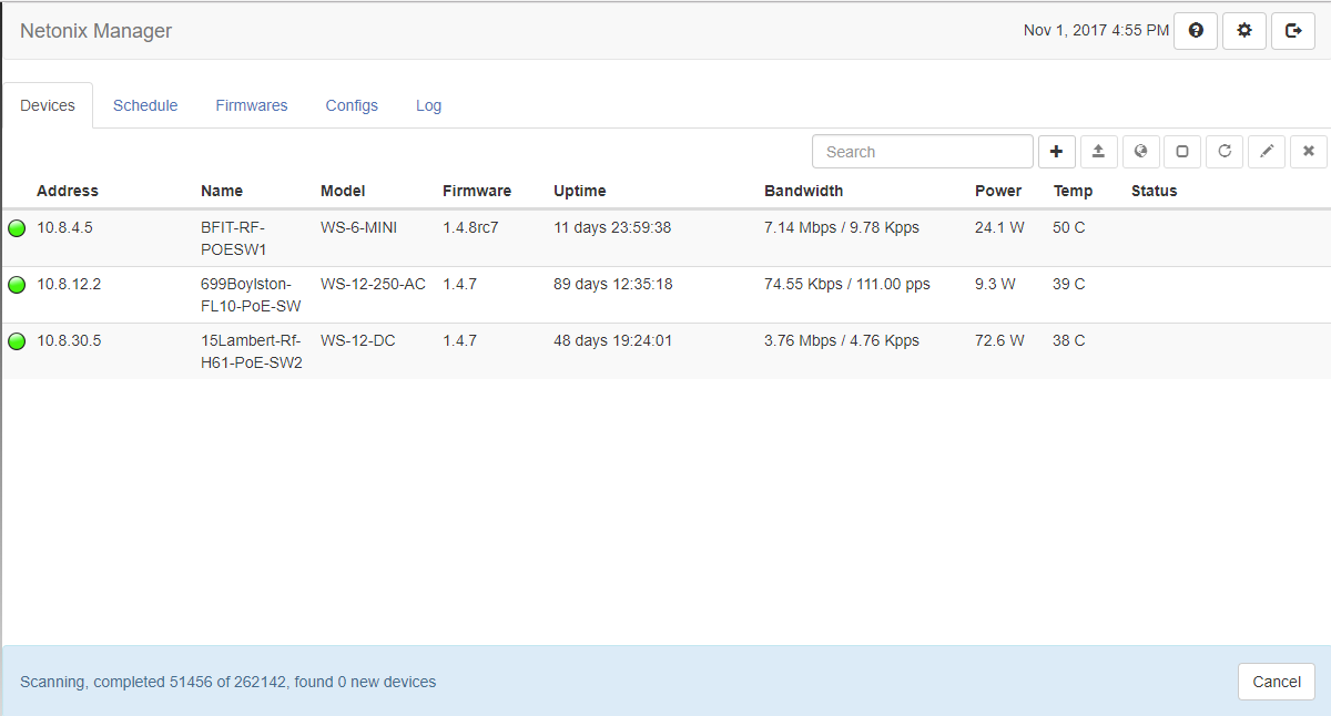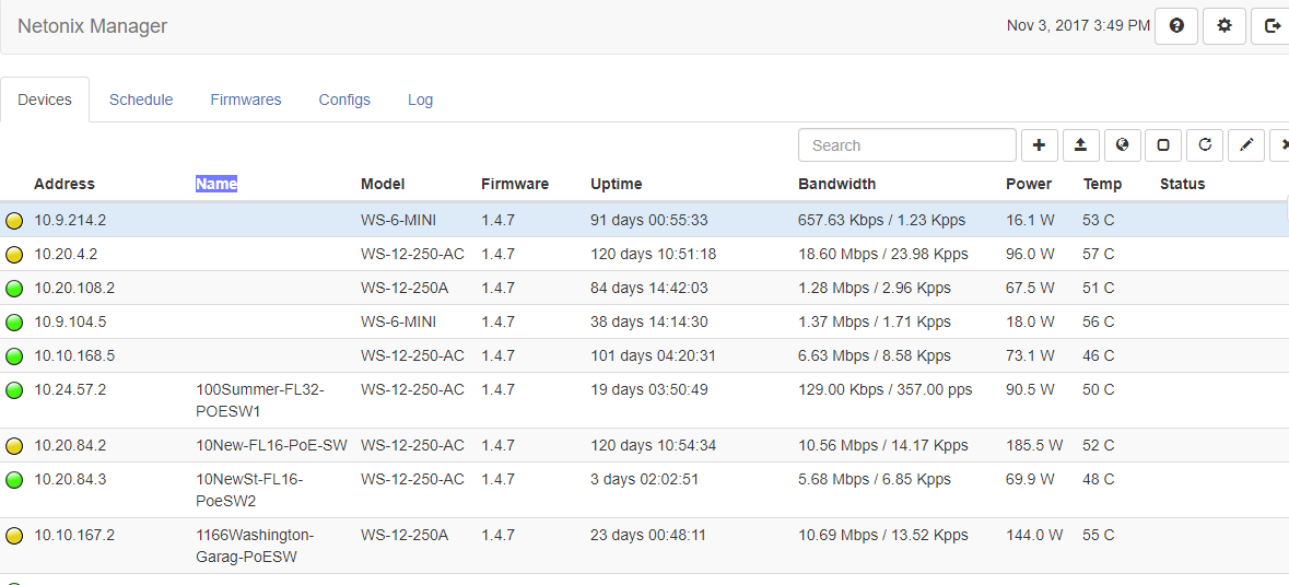 4. A day later I've scanned my whole network. I should have 156 Netonix devices but there is no easy way to get a count of what the manager has found, short of scrolling and counting lines (some single, some double) on the screen.