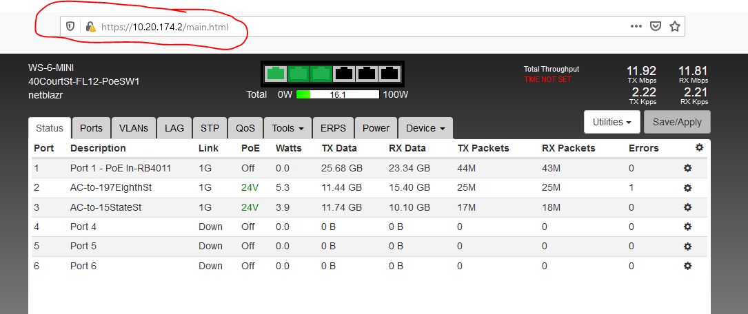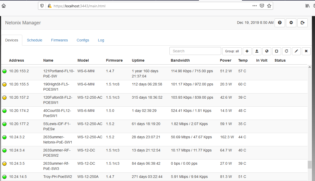 As I mentioned in my last post, I'm running the Netonix Manager on a Windows 10 computer that has a VPN connection to our network. All of the switches have management addresses in the 10.0.0.0/8 address range. All of the switches are accessible if I go directly to their management addresses in a different tab of the same Firefox browser.