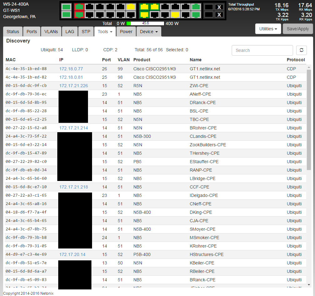 And if you have v1.4.2rc6 installed and enable the Discovery Tab you can log into your tower switch and discover all UDP, CDP, LLDP devices on that layer 2 segment and know stuff about them and launch their web UI with a click, see picture below: