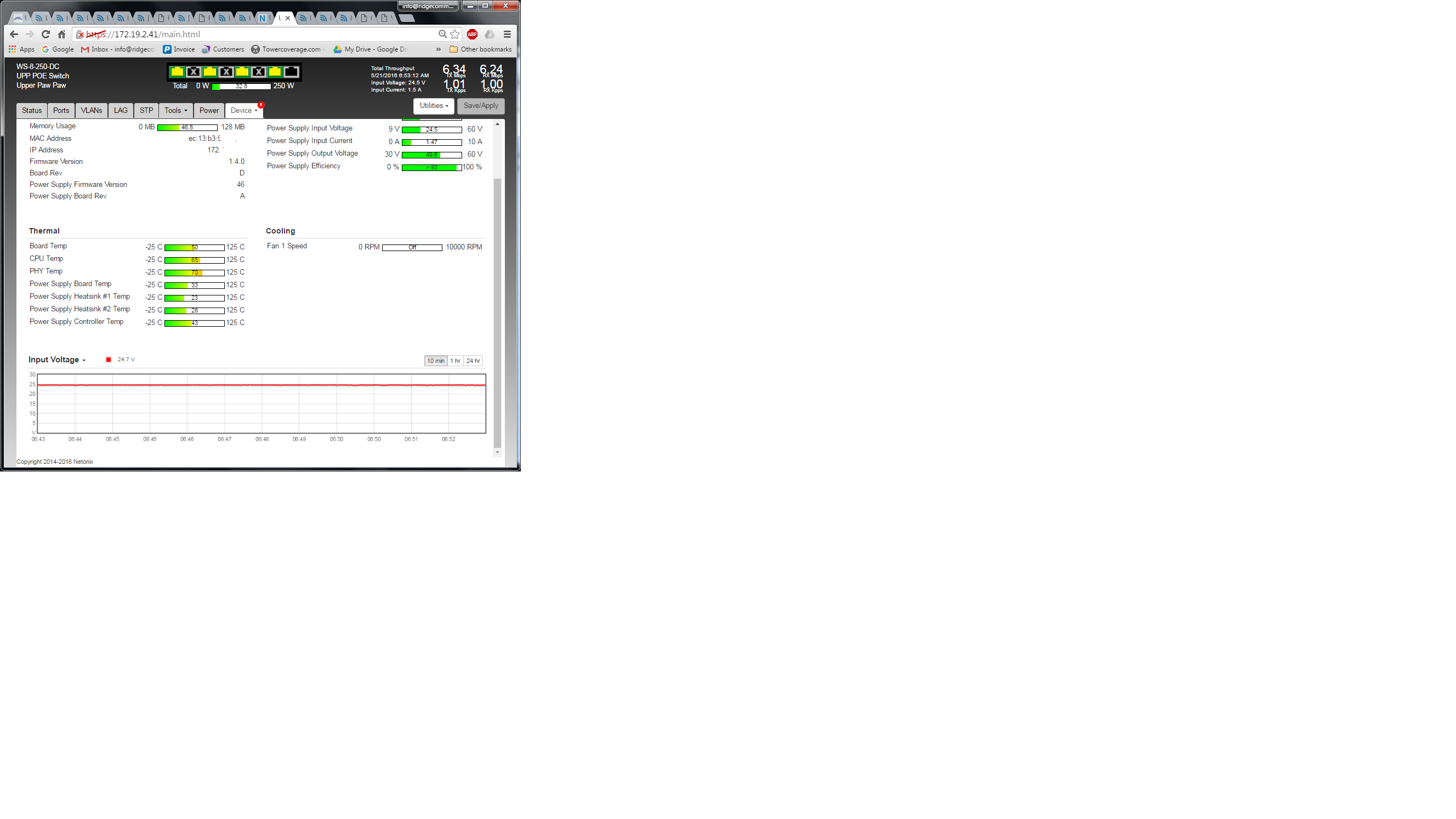 Yesterday afternoon the old switch (running 1.3.2) went down and didn't come back up until about 1:30 am this morning. We could log into the backhaul and the backhaul showed link at 100 Mbps Full duplex, but we couldn't log into the switch or anything past it. The backhaul is a NanoBridge and we have three Rockets hooked to it as APs.