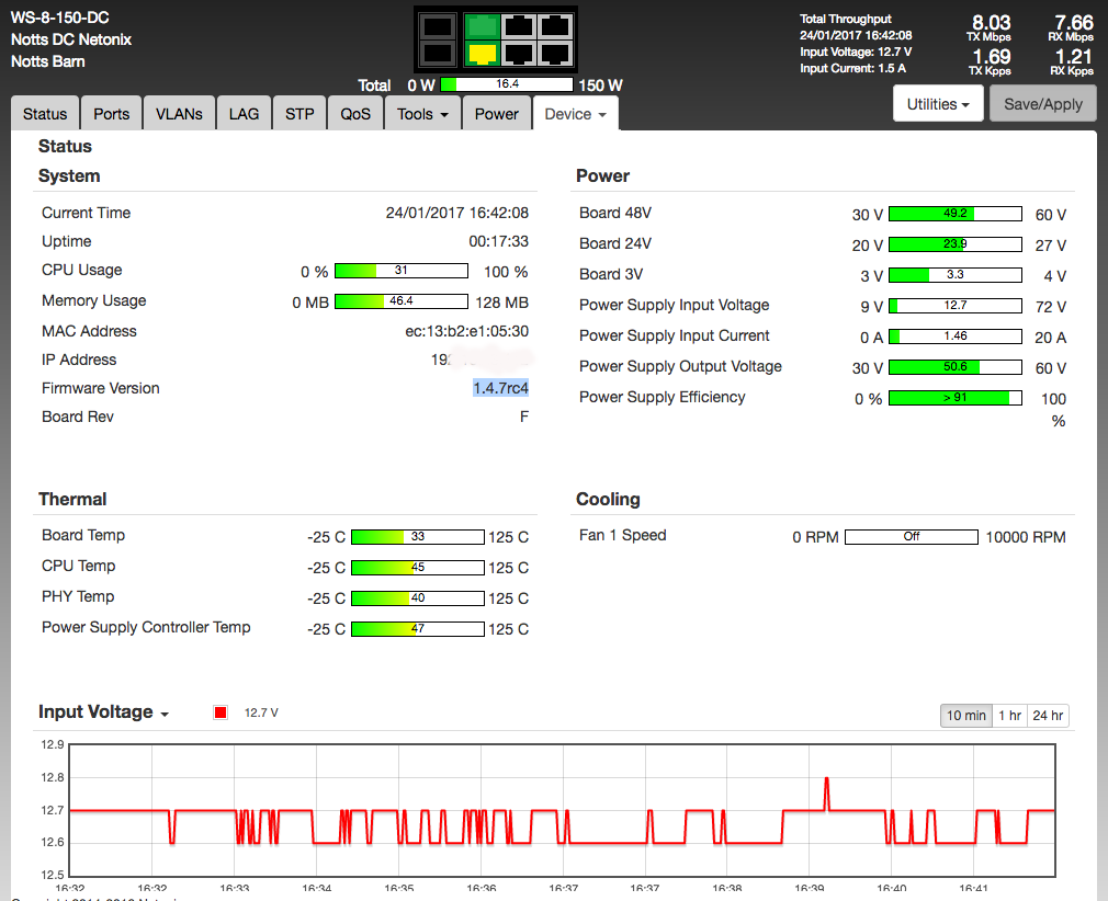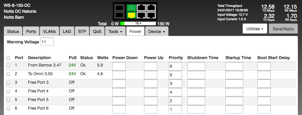 This morning ( -3 C) we had one warning email for 11v and WS-8-150-DC 'died' or should I say was not contactable remotely in spite of the Powerbeam still contactable/working. Went up and found the volts were 11.7 (photograph of volt meter in box) but NO lights on the WS-8-150-DC . Changed the batteries and saw the LED's glowing on the LAN outputs and I think the 'master' LED on the WS-8-150-DC (sun shining on it). Saw we had output on the Rocket (on phone). Went away