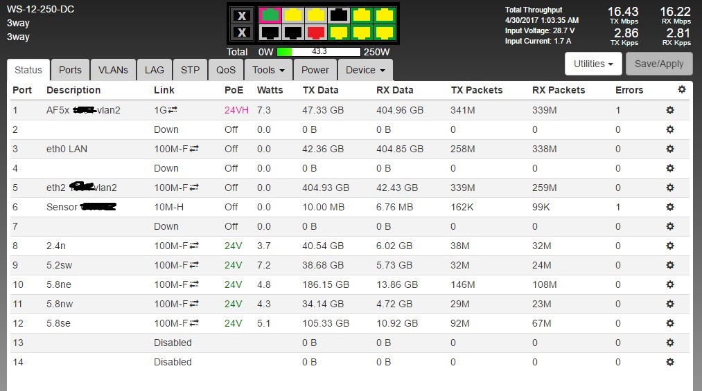 Attached is a dc 12port tht has what it shows on it and the power if it helps you to compare how much it uses. This is at 1 am in the morning out in the rural areas. Approximately 70 subs on 4 RM5.s and 1 RM2. One AF5x backhaul.