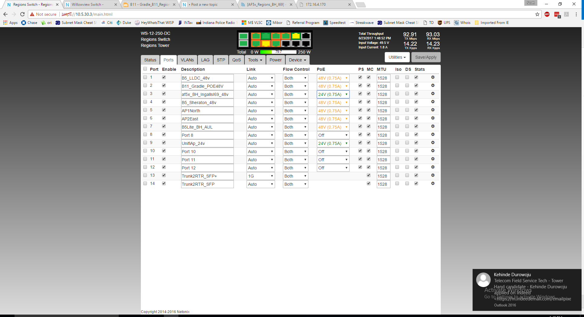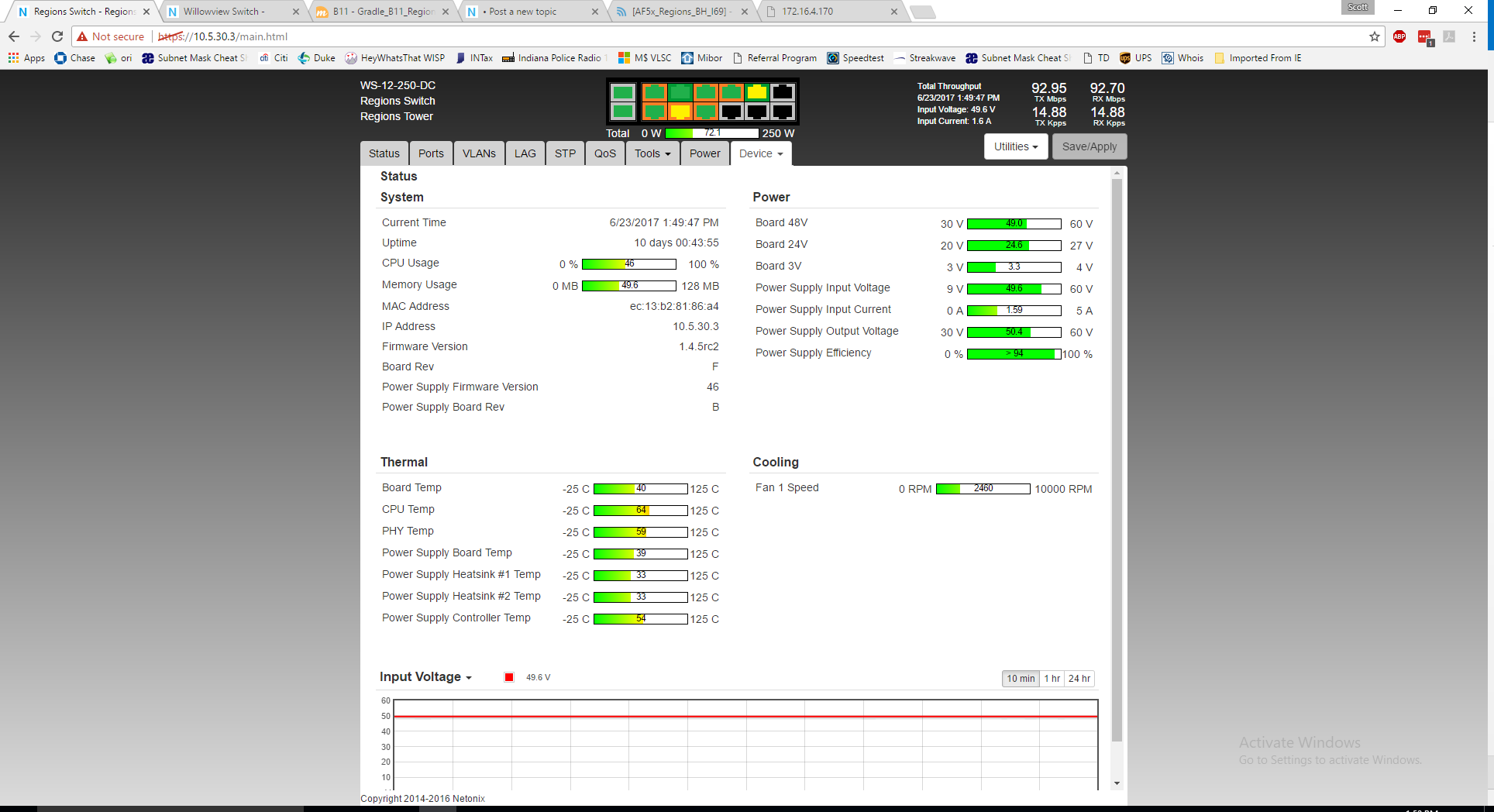 I have two tower sites that are experiencing radios rebooting issues during rain and or stormy weather. today its just raining, no lightning that ive seen. Both sites are using a Netonix DC based switches and 48v battery powered. one site is a high rise roof top and the other is a commercial tower site. both have good grounding / lightning protection. switches are grounded, radios are grounded. Normally the switch doesn't reboot and my cambium gear doesn't reboot, just the mimosa & UBNT gear reboots. See below log from the high rise switch for todays activity. Any suggestions on how to fix this?