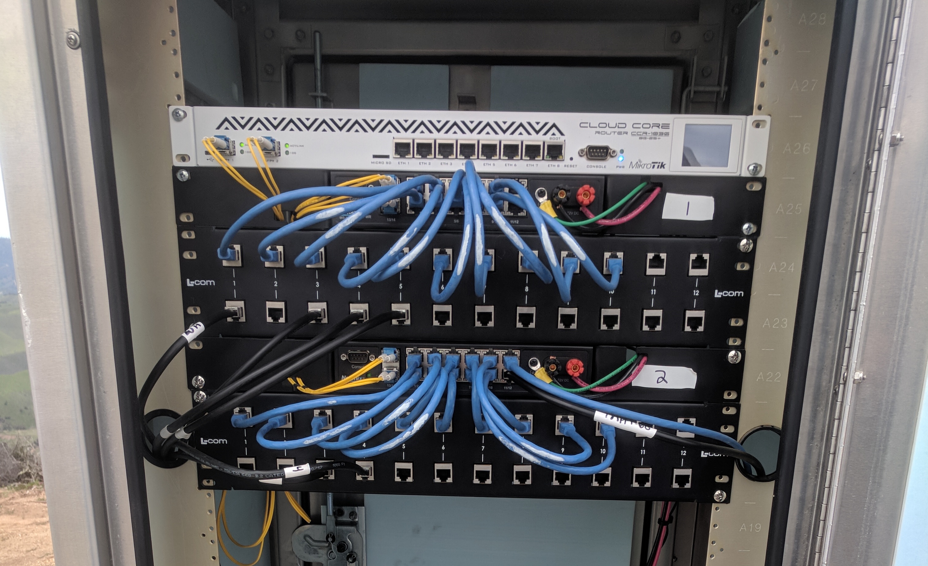 We have just started using WS-12-250-DC and ground using the front ground screw. We are also using L-Com rack mounted lighting protection. This model. We have the main Cat5e line from the radio coming down into the enclosure then running into the lighting protection first. We then jumper out of the lighting protection and connect into the switch. We then have an optical fiber going from the switch into the router for further isolation. Both lighting protection and grounding are sharing the same ground bus.