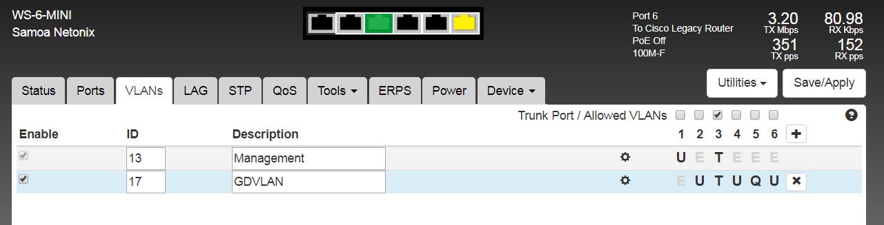 Problem: On this 5th switch that I just installed, when I change the VLAN tag to Q on a port that is not up it stops the traffic on a port that is up with the same VLAN. It does not affect my management VLAN which is 13. The VLAN that is negatively affected is 17.