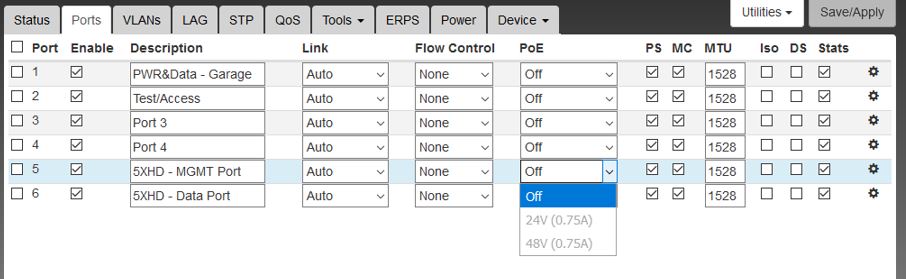 kordwood wrote:I have a WS-6-Mini being fed with 48VH on port 1 from a WS-8-150-AC. The WS-6-Mini is connected to a Ubiquiti 5XHD on ports 5 and 6. I am able to turn on 24V on port 6 to power the 5xHD, but I would like to have 24V turned on port 5 as well to have a redundant power feed to the 5XHD. When I go to to POE drop down for port 5, both the 24V and 48V power options are grayed out and I am not able to turn on the 24V. At the other end of my PTP I have a WS-12-250-DC connected to both ports on a 5XHD and I am able to turn 24V poe on both ports. Is there something that is limiting me from turning 24V on both ports for the WS-6-Mini? Thanks