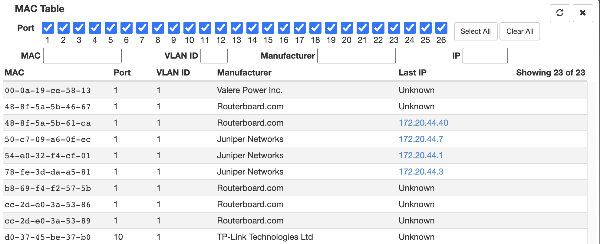 I'm trying to move a WS-26-500-DC from the default ip address to one on our management vlan. The MAC Table shows that it is talking on that vlan ok: