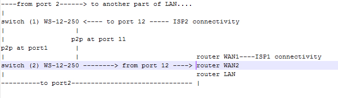 As you can see, there are two connections between switches but while the first connection (on port 11) is incomming connectivity to router (WAN2), other connection (on port 1) is the LAN behind the router. Both connections are two independent p2p wireless links. I need them both completely separate like independent switches. Is there a solution for this task via VLAN?