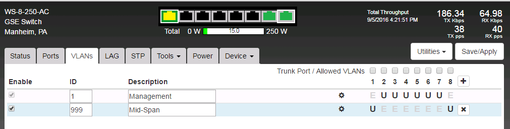 Now I can turn POE on Port 1 and power a radio and use port 8 to go to a router and I now have a manageable mid-span injector. Ports 1 and 8 are seperated into a little 2 port logical switch / mid-span injector that you can manage.But since I used U on Ports 1 and 8 the ports will only accept Untagged packets and will not allow VLAN tagged packets to pass.