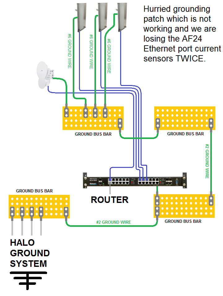 So tomorrow (Monday) we are starting the process of adding a new #2 green that goes from the original lower ground bus to the original upper ground bus next to the AF24 radios. We will also make sure there is a sufficient Ethernet service loop on the AF24 radios to insure that the Ethernet path (cable length) from the radio to the grounding system is longer than the intended grounding path (cable length).