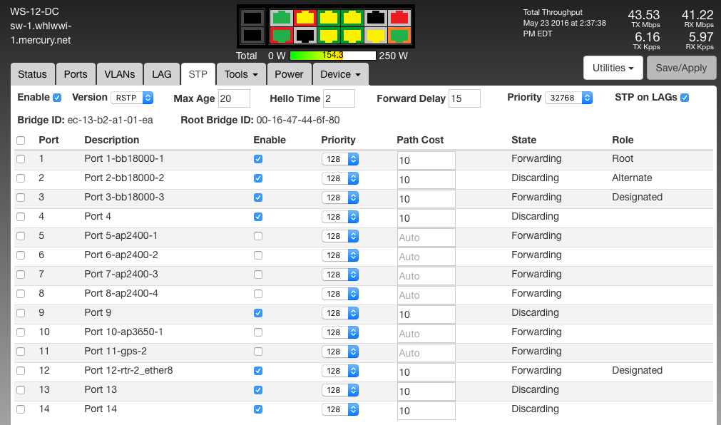 This switch sits between a Cisco switch off Port 1 and a Mikrotik off Port 2 speaking RSTP.