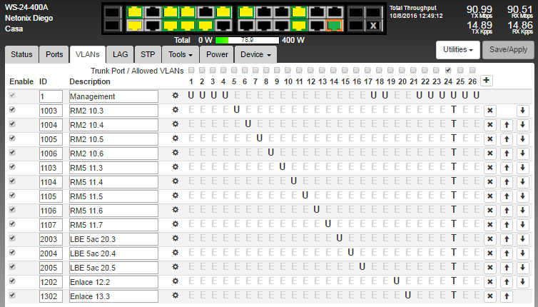* 2 hot I disconnect devices are in port 19 and 20 (UBNT AirGrid Firm.v5.6.6 M5 HP xw), 3-5 seconds and then everything starts and traffic normally.