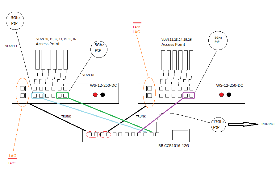As depicted in picture on first and seconds switches I have only tower AP traffic. The backhaul is only one separated and directly connected to Mikrotik.