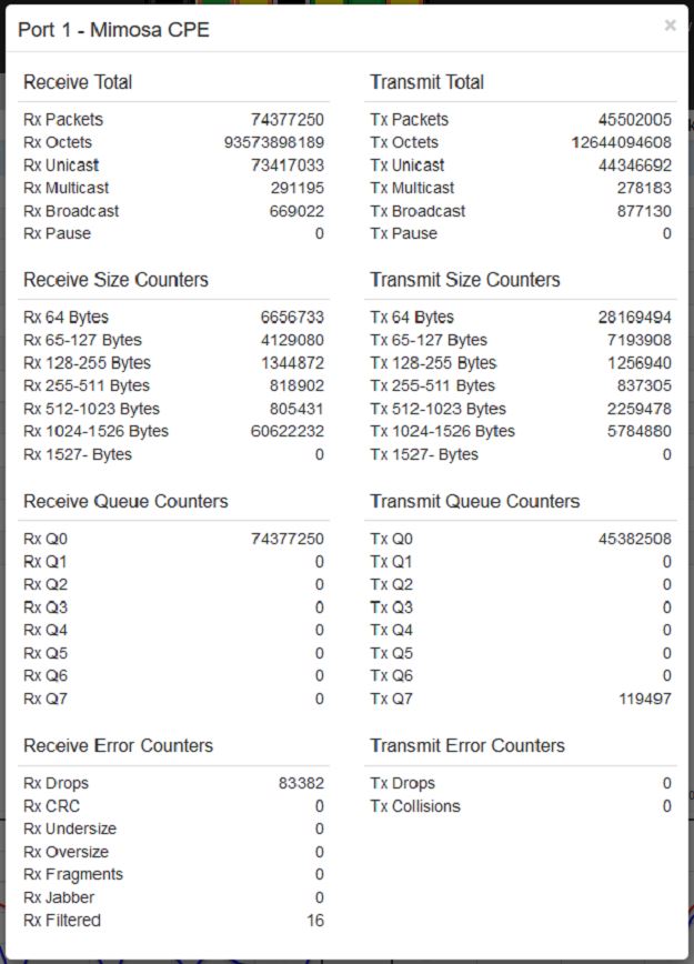 when i look at the port stats for port 1, Mimosa C5 link i see high "Receive error Counters" 83382 and "RxFiltered" 16. not sure what would cause this, or if these are dhcp packets.