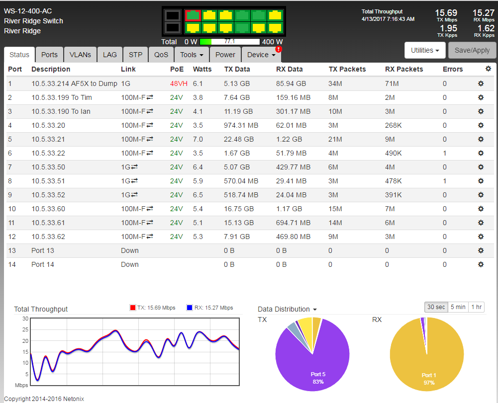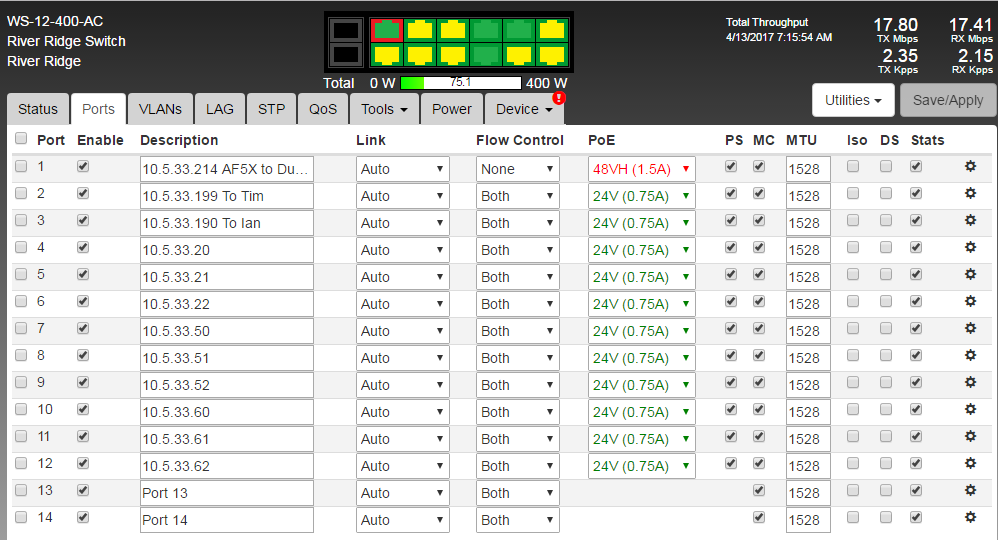 Just replaced a couple tough switched with a WS-12-400-AC on Monday. I started noticing dropouts on most of the connected radios yesterday (Tuesday). The switch is running 1.4.6 (I don't like running rc firmware on my production network), the devices that are rebooting are all Airmax and Airmax AC. The sole AF5X is not having issue, it has been consistent since I first booted it up 2 days ago. I will post the log since the last switch reboot 2 hours ago. We only rebooted in an attempt to correct the issue. Any ideas?
