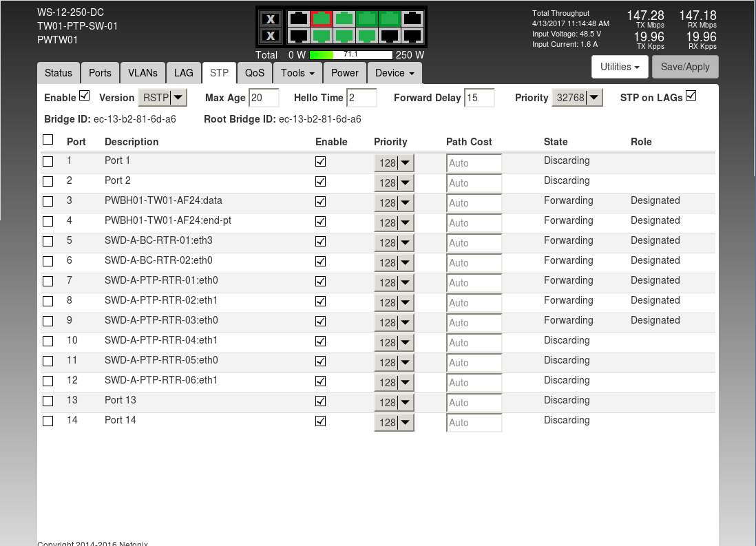 With that out of the way, here are the switch tabs for switch 1. Switch 2 is nearly the same except for PTP link names and minor port differences.