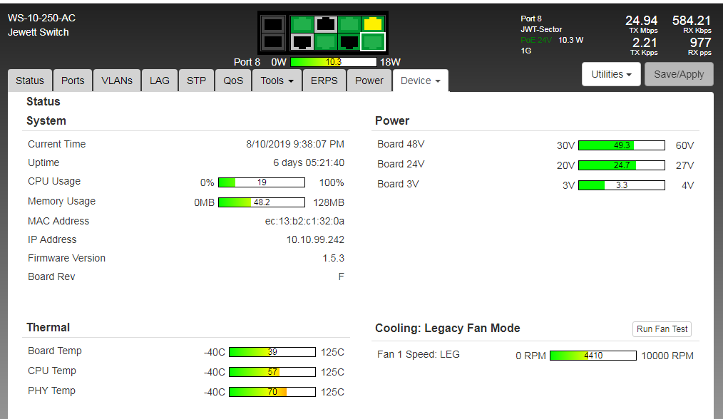 Are there any posts newer on this subject? I have a WS-10-250-AC with the same issue. I have read all the suggestions in previous posts and tried all. I have changed ports, then replaced cable and tested cable, then changed radio. I have also replaced the switch. The radio on that port is a Rocket Prisim 5 AC Gen 2 on a sector antenna. I also reworked all the grounding where service entrance ground, switch ground, and tower ground are all bonded together. Nothing has slowed it up it's doing it very frequently causing jumpy, jerky connections on the sector.