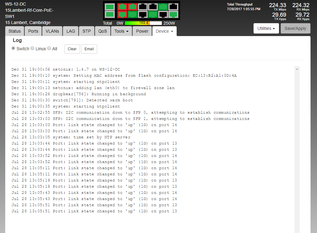 Running 1.4.7. Started getting packet loss, which I've traced to switch ports flapping. One peculiar thing is the log only mentions ports going up, never down, and yet packet loss suggests this is real. Logging into the switch, it looses communication with the upstream router for a second or so several times a minute. Ports 13 & 14 are the connections to the upstream router (vlans to different radios divided between ports, but management via either). The upstream router is a MikroTik CCR1036-8G-2S+ and it thinks the two Ethernet connections to Netonix SW1 are stable and have been up for days. Yet clearly traffic stops flowing for a second or so several times a minute.