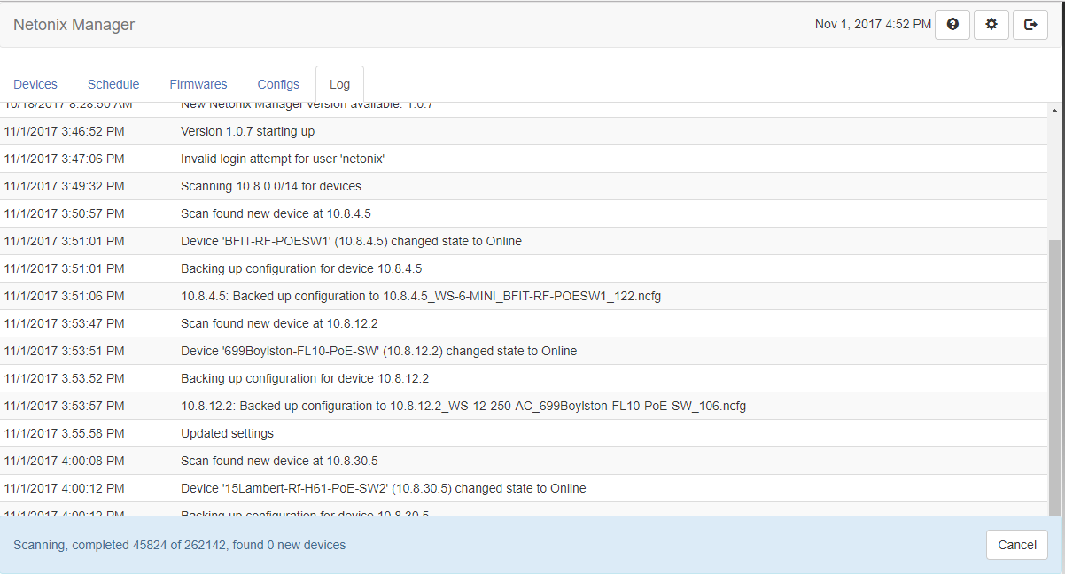 3. I started a scan of 10.8.0.0/16. It found three devices rather quickly but clearly had a long way to go. On the assumption this would take many hours but would finish before I returned, I added another scan (for 10.12.0.0/18). This caused the # of devices found to reset to zero even though the original scan was obviously proceeding and the devices display still shows the three devices found so far. (Images 2 & 3 below). When I came back, the 10.8.0.0/14 scan had found all 51 switches that are actually in the range 10.8.4.5 thru 10.10.211.2.In addition, the scan of 10.12.0.0/18 had also found 5 switches in the range 10.12.25.3 thru 10.12.35.2. So I now have 56 switches in the "Devices" list but the log is as shown in image 4 below. I conclude that you can add an additional scan before an earlier one has ​completed and it will work but the count will be short by however many devices had already been found when the second scan is initiated, i.e. defining a new scan resets the counter even if an existing scan is in progress.