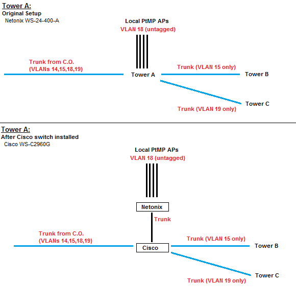 Trunk from our C.O. (central office) is feeding the tower (A) that had the issue. I'm also feeding a few other towers (B & C) on different VLANs.