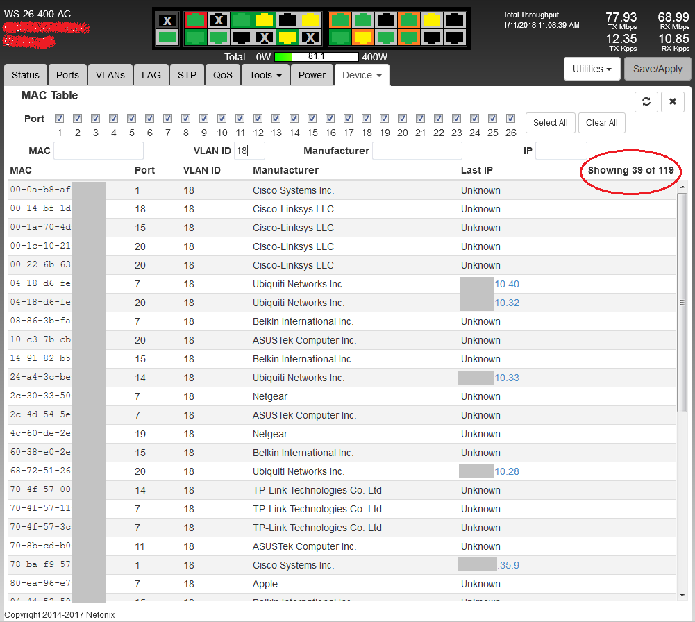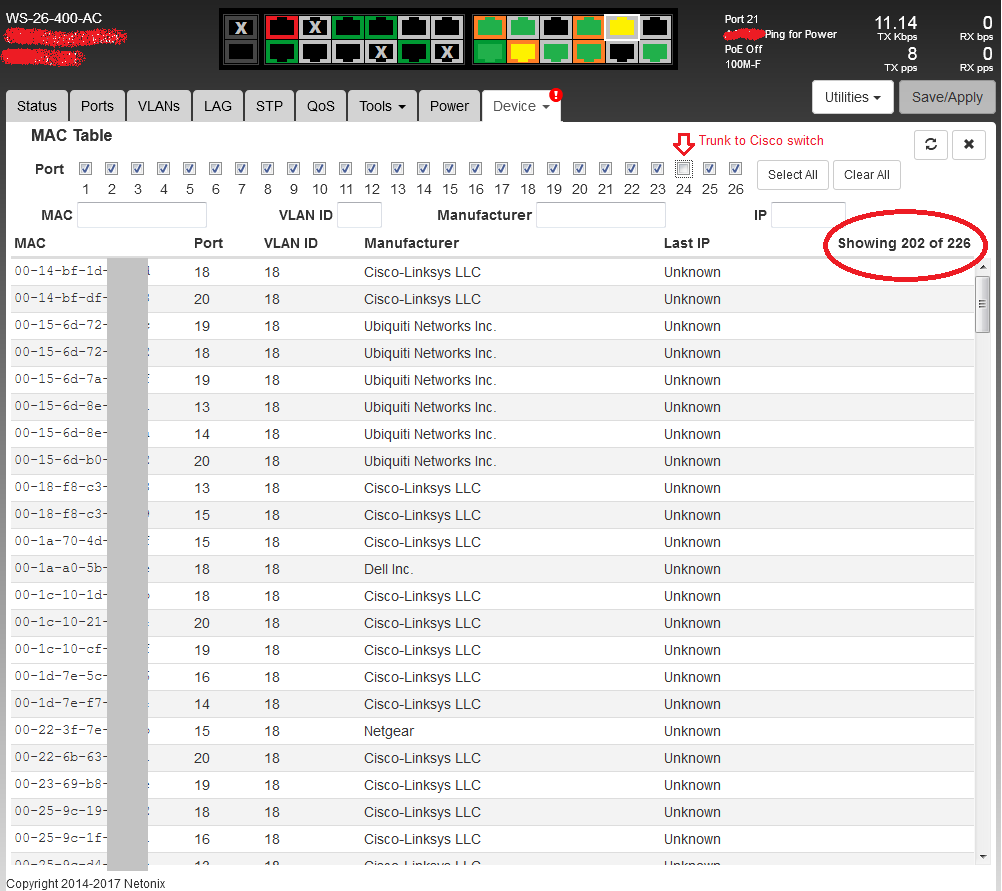 Notice, with all devices off of the Netonix other than the PtMP APs (on VLAN18) the MAC table is populated correctly.