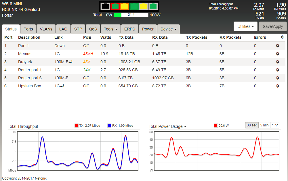 Port 3 seems to be drawing intermittently ~0 and 20W, which would bring total consumption up to ~45W. Total Power Usage chart confirms this, normally stable at around 20W with spikes up to just over 40W