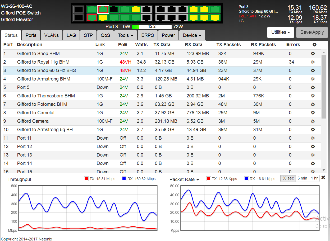 I did go double check my switches last night and confirm they are reporting correctly. If you look below you can see I selected port 1 which is the port connected to the AF24 radio. The graph corresponds correctly to the traffic coming across that AF into and out of Port 1