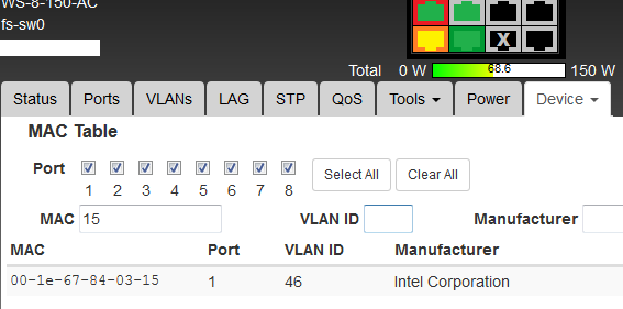 VLAN / Device/Status / MAC Table
