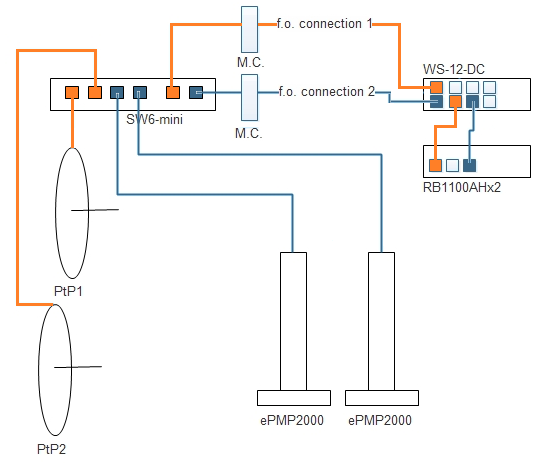now I have added the router; we are on the same site (roof) but we have 2 mast, one on one side and one on other side of the roof; on one mast we have 2 AP and 2 PtP with one WS6 and on the other side we have the WS12-DC, RB1100AHx2 and the ePMP2000 sector. If we connect 2 f.o. from ws6 to ws12 we would separate traffic of the APs and the PtP.