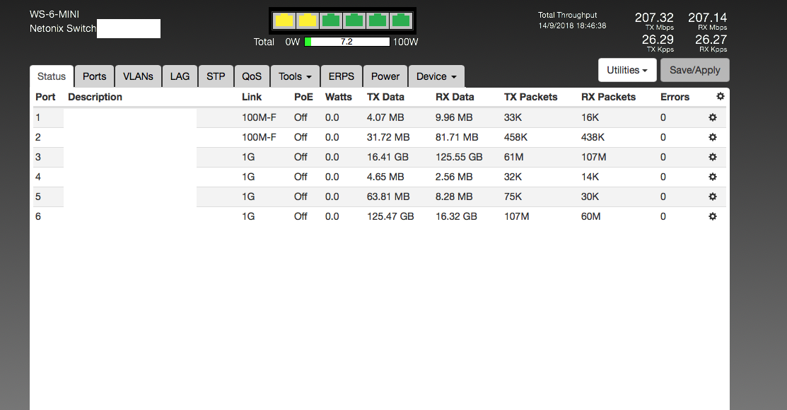 The switch is in firmware 1.5.0 and is not delivering power to any device. 4 PC's are connected and one Mikrotik CCR router.