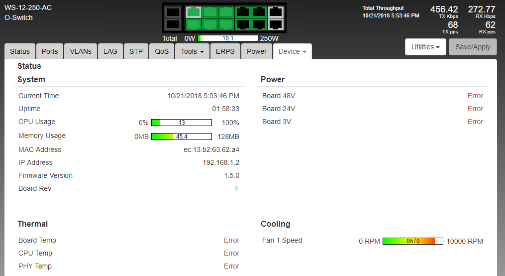 I recently purchased the WS-12-250-AC, the minute I plug multiple PoE devices on it the screen changes with Error under the Watts column. The status screen shows errors as well plus the fan is always running regardless that this switch is in a temperature control room. I have reset the switch multiple times and uploaded the firmware with the v1.5.0 release. Should this be sent for RMA? Please advise…