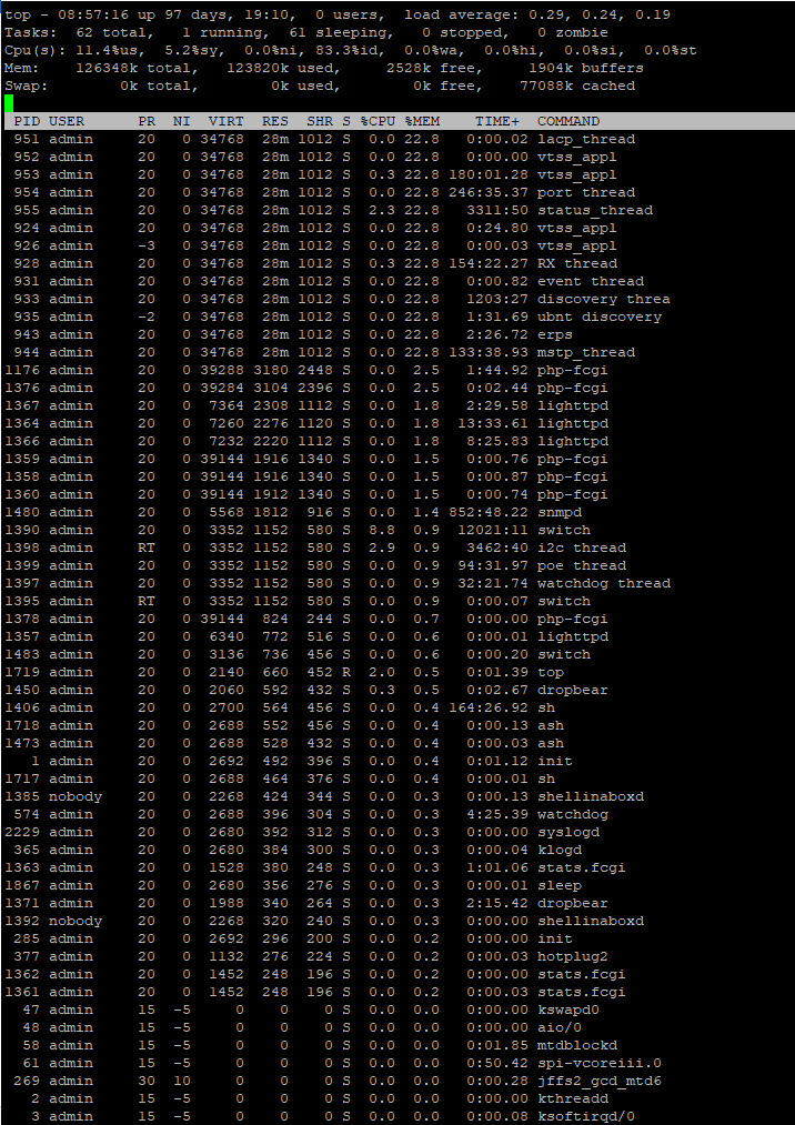 Eric Stern wrote:The Discovery process is taking up an awful lot of CPU time here, it really should never be more than about 5%. That would indicate either you are running a large flat L2 network (which is a bad idea) or something else is causing excessive discovery traffic on the network. You could try disabling discovery on the switch temporarily to see if the reboots stop.