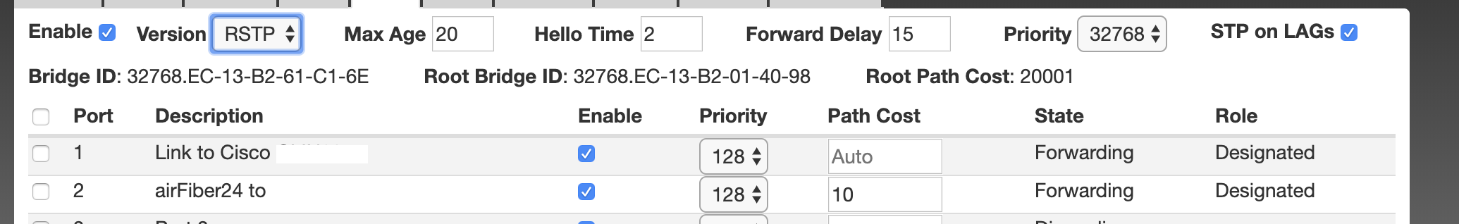RSTP is enabled on all of them with a Max Age of 20, A Hello Time of 2, a Forward Delay of 15.