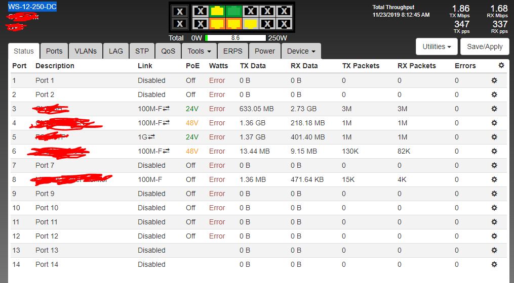 One of our WS-12-250-DC switches we have deployed at a tower site started showing the word "error" in the field where it normally shows the watts for every port.