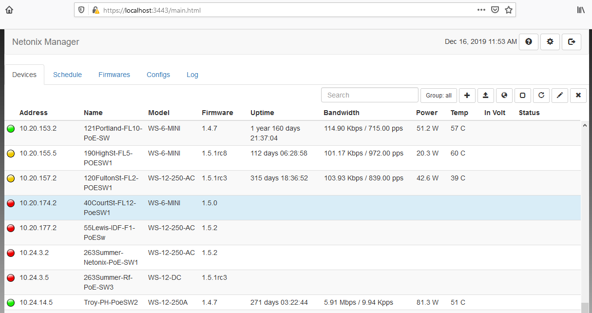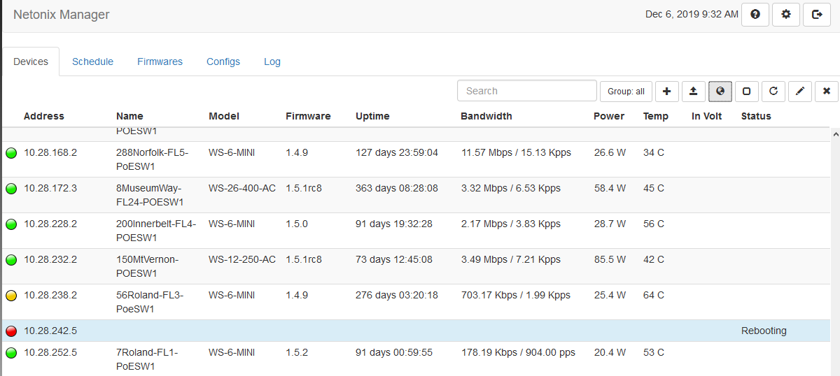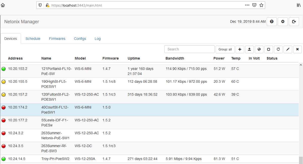 I've been running the Netonix Manager on my Windows desktop machine since last week. When I came in this morning, many of the switches show red. It is possible the VPN from my office to our network went down at some point, but it is up now and has been up for more than 12 hours and yet, some devices are still red.