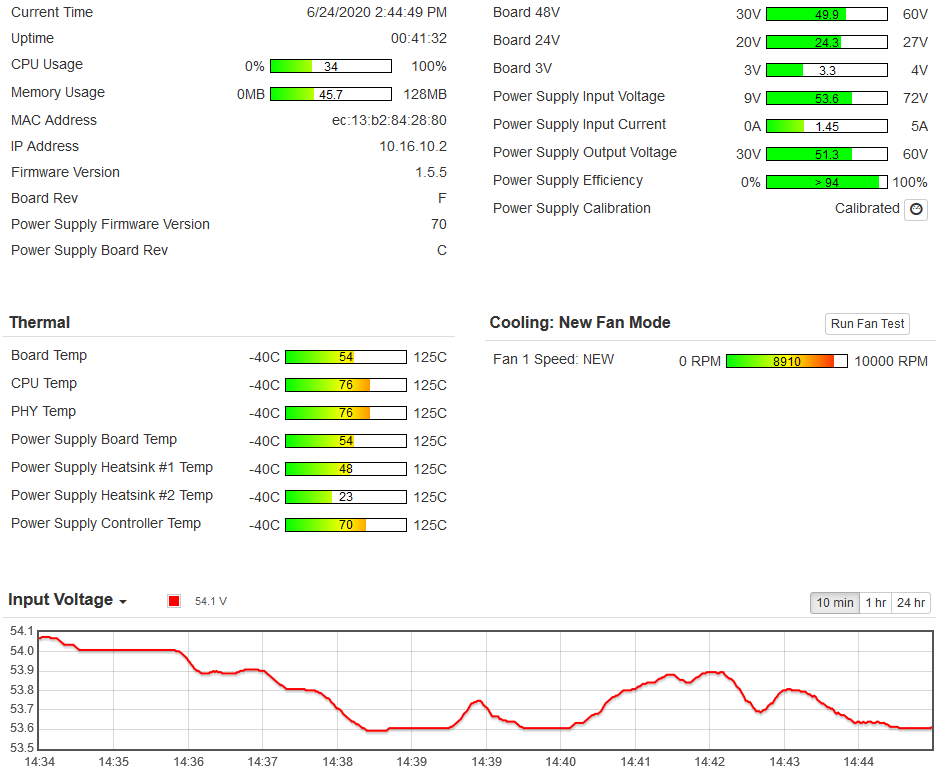 While viewing the system status it's showing some odd information, reporting 0.0V input voltage on the graph, but the line is up around 54v which is about right. Input current shows "infinity" but the graph appears to have the correct value. Efficiency is blank, but again the graph appears to show correct values. This behavior is the same in multiple browsers, though as I typed that sentence it snapped to working in chrome, and opening again in firefox shows data.