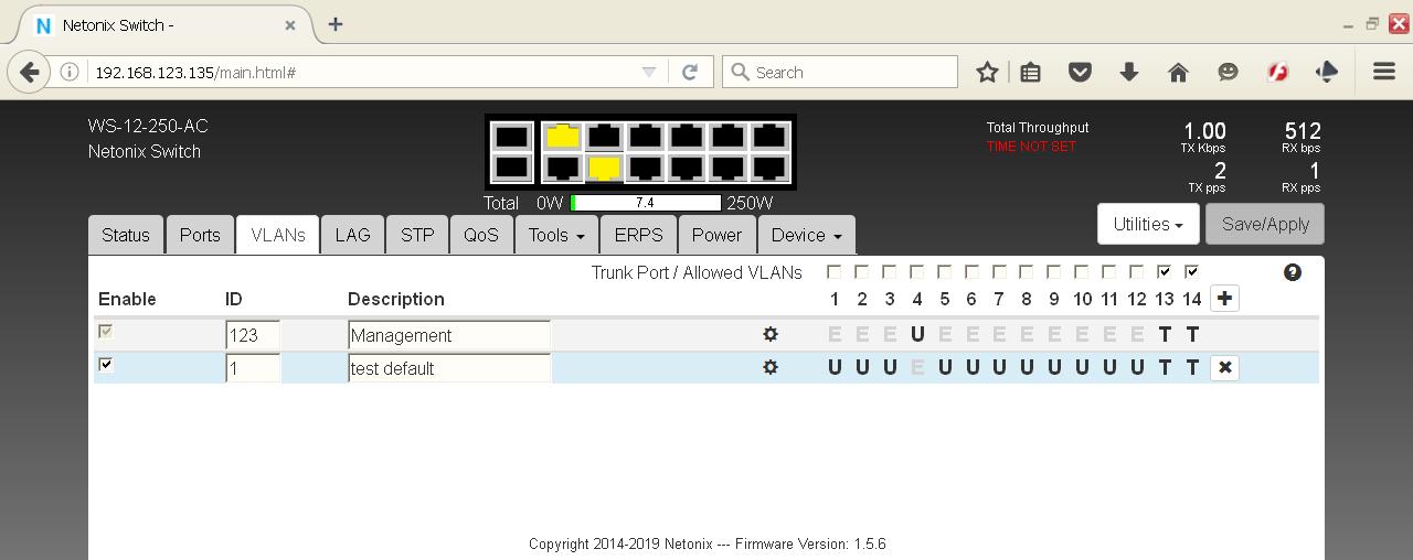 Add VLAN reusing VLAN1. Add test VLAN1 IP: 192.168.1.21/24; port4: E; ports 13 & 14: T; all others U
