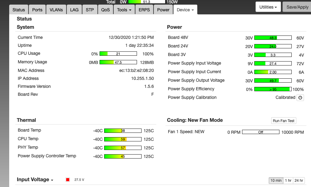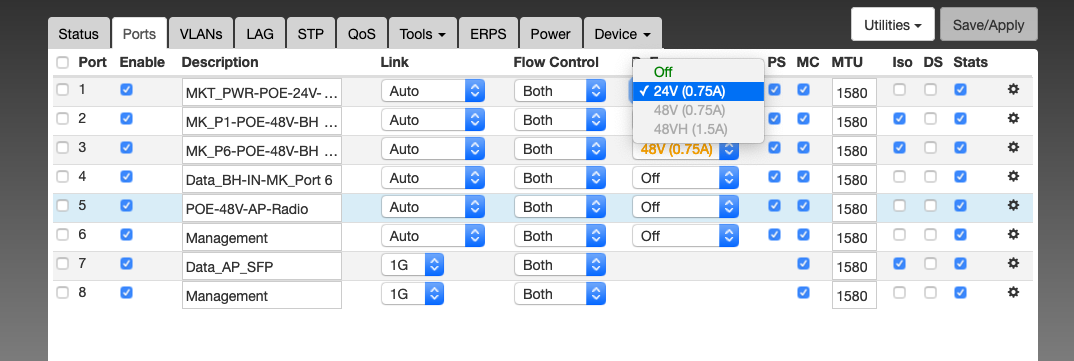 Here are some snips of status (Device) page now (no POE on port 5 for the AP)