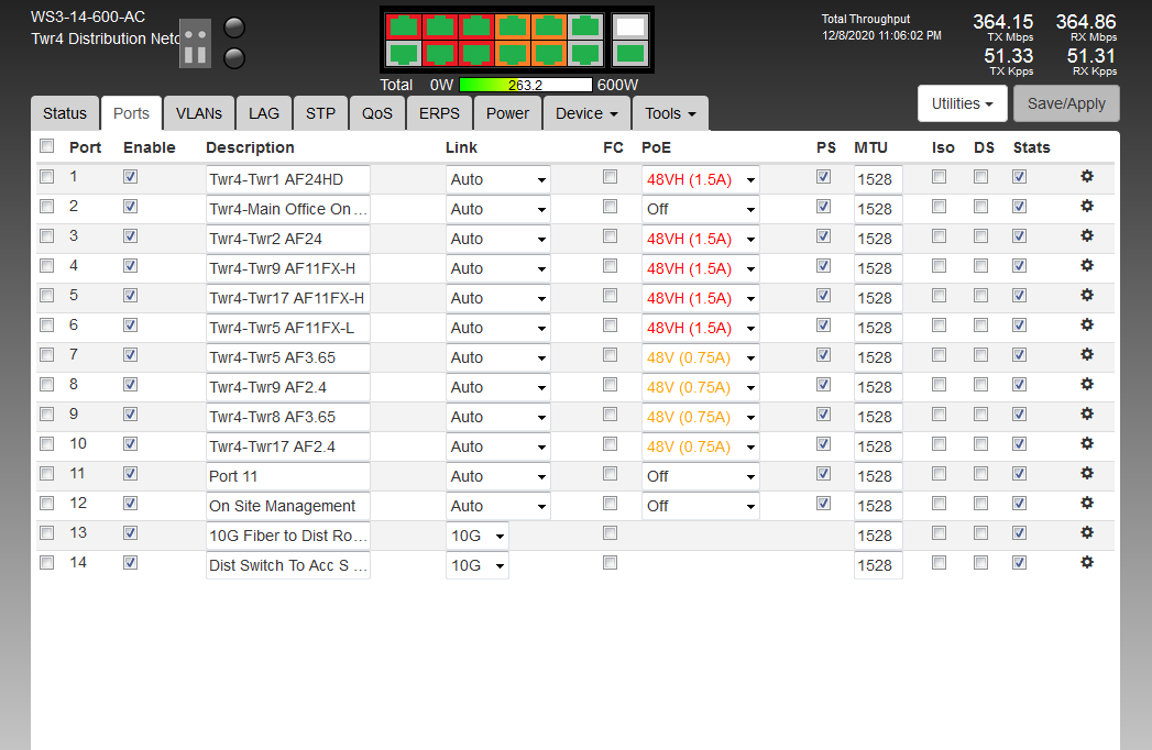 Deployed the first WS3-14-600-AC into production and when we got it in place the management vlan isn't passing traffic. All other vlans are passing traffic just fine like they did in the lab. Should have tested the management vlan. Weather has kept me from going back on site to take screen shots but ospf vlans are tagged to the corresponding tower and work perfect and the vlans tagged across the SFP+ ports pass just fine but I cannot get tagged management vlans working. I have tested this on a backup WS3 with different router and nothing on management is passing. We are using Mikrotik CCR routers and the same setup with the original WS has worked just fine.