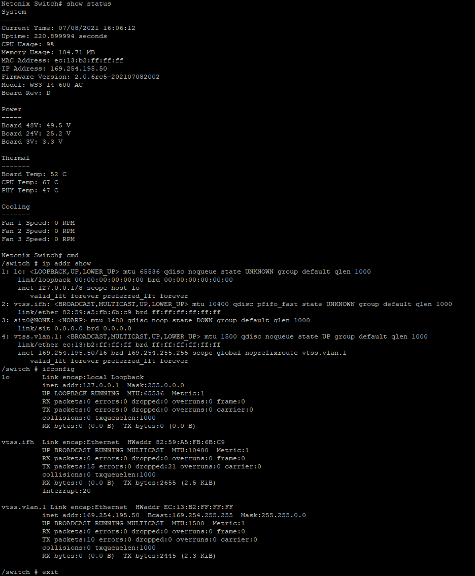 4.1. 'ip address' command reports switch IP is 169.254.73.148