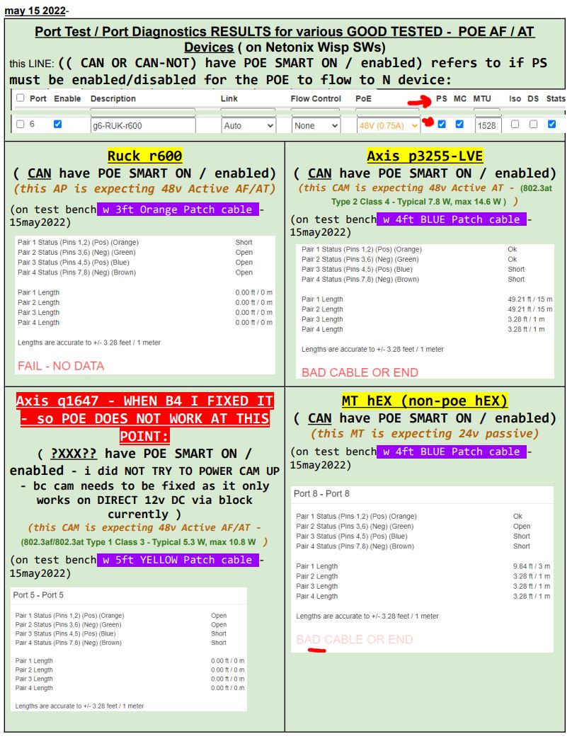 I discovered Netonix about 6 months ago, ive been deploying their switches anytime i need to add or replace a POE switch (generally). I love the Cable Diagnostic function, and noticed how different (good/working and POE failed) devices can give different output. So i made a rough reference chart on my test bench for when im deploying out in the field. I figured i would share it here (and will try to keep it updated as i add more devices over time).