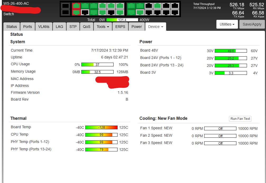 I installed a brand new WS-26-400-AC six days ago. The fans are only turning on once CPU temp goes above 100c and turn off once it's back down to 100c. The board temp is very high - once above 127 it reports as "-128". The next switch down the line is passing 80% of the traffic that this one is and it's sitting at 80c cpu and 50c board temp. I have many other models in the field with similar temps, most are in worse environments. Ambient temp here is currently 31c (88f). This is my only switch on 1.5.16 firmware, the rest are still 1.5.14. Is this a firmware issue? Any advice is appreciated.